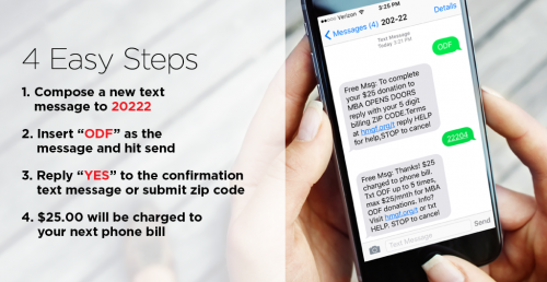 A one-time donation of $25.00 will be added to your mobile phone bill or deducted from your prepaid balance. Donor must be age 18+ and all donations must be authorized by the account holder (e.g. parents). By texting YES, the user agrees to the terms and conditions. All charges are billed by and payable to your mobile service provider. Service is available on most carriers. Donations are collected for the benefit of the "Open Doors Foundation" by the Mobile Giving Foundation and subject to the terms found at www.hmgf.org/t. Message & Data Rates May Apply. You can unsubscribe at any time by texting STOP to short code "20222"; text HELP to "20222" for help.